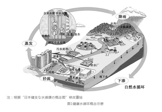 2014年至今,日本城市水系統(tǒng)進(jìn)入了體系優(yōu)化階段,這一階段最顯著的特點(diǎn)是健康水循環(huán)理念得到前所未有的重視,城市水系統(tǒng)工作從要素治理向系統(tǒng)綜合整治轉(zhuǎn)變。事實(shí)上,日本很早就開始重視水循環(huán)的重要作用,2000年制定的《全國綜合水資源計(jì)劃》(又稱“21世紀(jì)水計(jì)劃”)就提出了構(gòu)筑可持續(xù)的用水體系,適應(yīng)循環(huán)型社會(huì)發(fā)展的要求,但由于種種原因,這一理念在涉水工作發(fā)展進(jìn)程中并未被完全落實(shí)。隨著日本經(jīng)濟(jì)社會(huì)發(fā)展模式的轉(zhuǎn)變,人口老齡化和氣候變暖等多種因素的影響,加以城市水資源、水環(huán)境、水安全問題仍舊凸顯,日本的城市規(guī)劃建設(shè)者開始意識(shí)到城市水系統(tǒng)是城市復(fù)雜大系統(tǒng)的重要組成部分,涉及城市水資源開發(fā)利用、水環(huán)境治理保護(hù)、水安全保障提升等全要素全過程,局部的涉水工作難以解決整體問題,需要用系統(tǒng)的思維來認(rèn)識(shí)和分析面臨的水問題,以城市為核心構(gòu)建健康水循環(huán)才能實(shí)現(xiàn)城市水系統(tǒng)對(duì)經(jīng)濟(jì)社會(huì)的永續(xù)支撐(見圖1)。