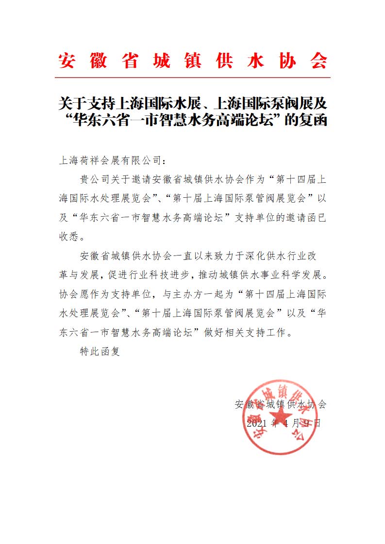 為幫助安徽省水務(wù)企業(yè)進(jìn)一步開拓市場(chǎng),促進(jìn)國(guó)內(nèi)外企業(yè)之間的經(jīng)貿(mào)合作與技術(shù)交流,安徽省城鎮(zhèn)供水協(xié)會(huì)決定將全力支持 2021 年 6 月 2 日在上海國(guó)家會(huì)展中心(虹橋)舉辦的2021華東六省一市智慧水務(wù)高端論壇,與主辦方上海荷瑞展覽有限公司攜手為城鎮(zhèn)水務(wù)行業(yè)搭建一個(gè)國(guó)際性商貿(mào)交流平臺(tái),助力企業(yè)更好的抓住行業(yè)機(jī)遇,積極促進(jìn)我國(guó)城鎮(zhèn)水務(wù)行業(yè)在"十四五"期間獲得快速發(fā)展。