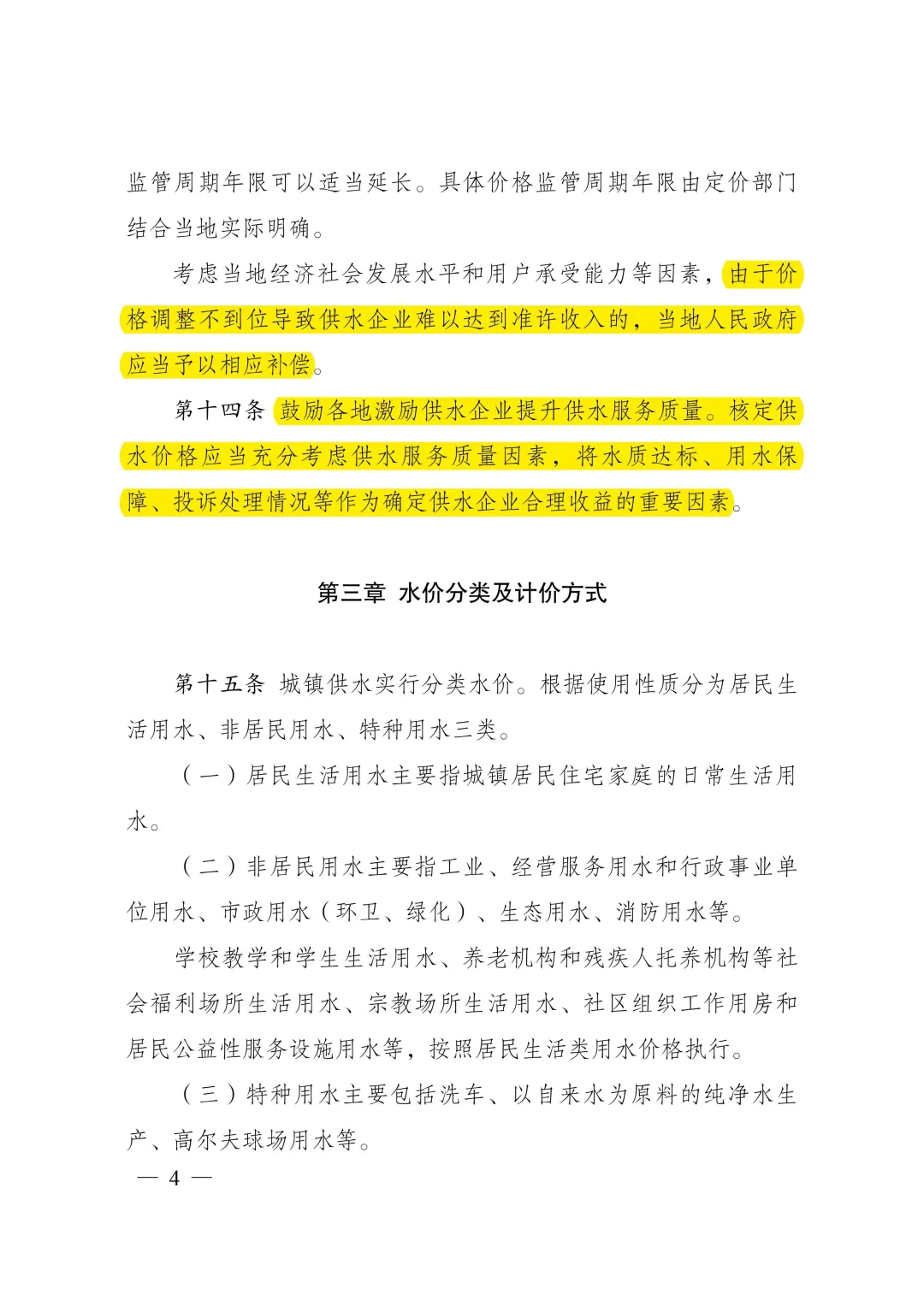 答:《城鎮(zhèn)供水價格管理辦法》明確了城鎮(zhèn)供水價格的定價原則、定價方法、定調(diào)價程序,以及水價分類、計價方式、規(guī)范供水企業(yè)服務(wù)收費行為等。主要內(nèi)容:一是按照“準許成本加合理收益”的方法核定城鎮(zhèn)供水價格。制定城鎮(zhèn)供水價格,以成本監(jiān)審為基礎(chǔ),通過核定準許成本、監(jiān)管準許收益確定準許收入,根據(jù)核定供水量確定供水價格,并統(tǒng)籌考慮當?shù)毓┧聵I(yè)發(fā)展需要、促進節(jié)約用水、社會承受能力、服務(wù)質(zhì)量等因素。二是簡化水價分類、明確計價方式。城鎮(zhèn)供水根據(jù)使用性質(zhì)分為居民生活用水、非居民用水、特種用水三類,居民生活用水實行階梯水價制度、非居民用水實行超定額累進加價制度。三是規(guī)范定調(diào)價程序、強化信息公開。要求制定居民生活用水價格水平或定價機制應(yīng)當按照價格聽證的有關(guān)規(guī)定開展聽證,并進行信息公開。四是規(guī)范服務(wù)收費行為、提升服務(wù)質(zhì)量。明確供水水質(zhì)、水壓應(yīng)當符合國家規(guī)定標準。除受用戶委托開展的建設(shè)安裝工程費用外,供水企業(yè)不得濫用壟斷地位收取供水開戶費、接入費、增容費等費用。