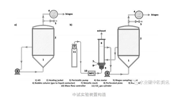 眾所周知,co2是在消化過程中伴隨著甲烷產(chǎn)生的產(chǎn)物。而另一方面,利用厭氧消化進(jìn)行co2捕集固定是一種潛力十足的碳減排策略。兩個(gè)處理食品垃圾的厭氧消化試驗(yàn)進(jìn)行了225 d監(jiān)測(cè),實(shí)驗(yàn)組定期使用氣泡柱充入co2(fernandez et al.)。實(shí)驗(yàn)組測(cè)試ch4產(chǎn)率為0.56±0.13 m3ch4/kgvs·d(對(duì)照組為0.45±0.05 )沼氣中ch4濃度為68%,額外攝取了外源co20.55 kg,h2濃度增加了2.5 倍,這歸因于co2溶解以及酸化與產(chǎn)氫途徑改變。