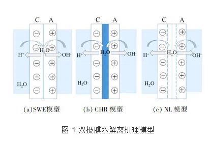 然而雙極膜中發(fā)生的水解離現(xiàn)象不同于通常的水解離,研究者們對其解離的過程機(jī)理開展了大量的理論研究,但限于過程的復(fù)雜性,目前還沒有達(dá)成統(tǒng)一的結(jié)論。根據(jù)水在雙極膜中間層解離過程的不同,主要提出3種解釋水解離機(jī)制的物理模型,見圖 1。