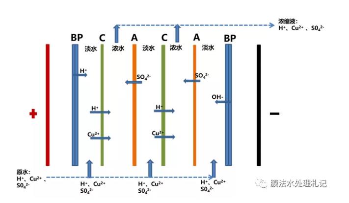 我們知道金屬離子一般是通過(guò)極膜滲透至極水室,而電滲析常規(guī)所用的極膜都屬于陽(yáng)離子交換膜,甚至有些還以全氟磺酸膜為極膜,在金屬溶液的系統(tǒng),它基本都會(huì)中招。系統(tǒng)避免溶液中的金屬離子進(jìn)入極室,上面原理圖只是一個(gè)參考,同樣市場(chǎng)上也有用陰膜做極膜、單價(jià)選擇性離子交換膜做極膜等,有興趣的可以再去做些延伸。
