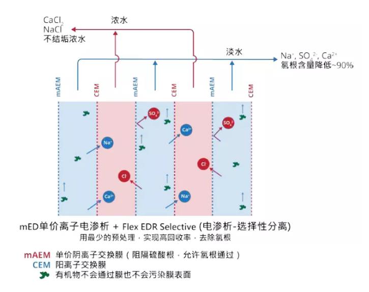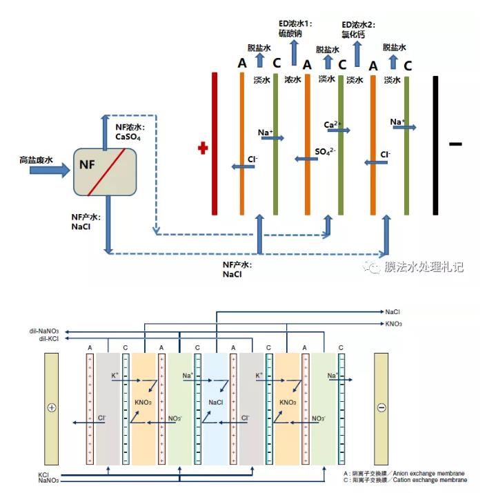nf-ed的聯(lián)用工藝可以算一個(gè)思路,工藝可行性沒有問題,它其實(shí)是置換電滲析(第二張圖)的延伸應(yīng)用。這種工藝在廢水處理需求中落地性會(huì)受限于多種因素,如廢水組成、濃水溶液的純度、脫鹽水的處理等。