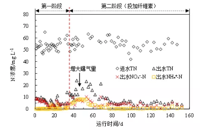 與此同時(shí),纖維素投加對磷去除的影響與cod類似,在纖維素投加初期(第36~50 天),出水總磷(tp)和正磷酸鹽(po3-4-p)濃度均開始惡化,去除率分別降低至51.99%和56.32%。從發(fā)生原因來看,do不足是導(dǎo)致磷去除效率下降的主因,可以從增大曝氣量后出水tp逐漸下降得到驗(yàn)證。然而,出水tp含量在提高曝氣量后的很長一段時(shí)間內(nèi)也沒有恢復(fù)至投加纖維素前水平,而是保持在(2.86±1.22) mg/l左右。為進(jìn)一步分析其原因,在第68 天從曝氣池末端取混合樣進(jìn)行了聚磷菌(paos)活性測定,并與投加纖維素前的活性進(jìn)行了對比。結(jié)果顯示,投加纖維素后,反應(yīng)器中paos比釋磷速率和比吸磷速率分別為11.3 和12.0mg/(gvss?h),與投加前的10.8 、13.4 mg/(gvss?h)相比變化并不是很大??梢姡w維素的投加對paos活性的影響并不大。因此,反應(yīng)器除磷效果恢復(fù)較慢的原因可能與纖維素投加初期導(dǎo)致的跑泥和生物量恢復(fù)較慢有關(guān)。2.2 纖維素對氮去除的影響圖3顯示了在投加纖維素前后裝置對氮去除效果的變化。從整體上看,反應(yīng)器無論是否投加纖維素均能夠很好地完成脫氮,投加前出水tn、nh4+-n和 no3--n平均濃度分別(5.9±3.1)、(0.40±0.96)(4.59±2.22)mg/l,投加后為(7.80±5.46)、(1.30±2.00)、(4.11±2.22) mg/l。只是在纖維素投加初期,出水tn出現(xiàn)明顯惡化,此時(shí)出水中nh4+-n明顯增多,這顯然與上述氧傳質(zhì)受限有關(guān)。圖3顯示,在增大曝氣量后對tn的去除效率迅速恢復(fù),主要是因?yàn)橄趸芰﹂_始恢復(fù)。