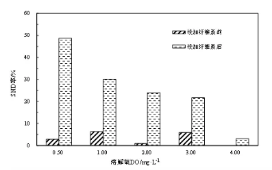 投加纖維素前后的snd效率見圖5,第一階段(未投加纖維素)無論do濃度多大,snd效率均不高(<8%);即使控制do在0.5 mg/l時(shí),snd效率也不過2.8%。相反,第二階段添加纖維素后,snd效率明顯提高,do=0.5 mg/l時(shí)達(dá)48.69%;即使do提高至3 mg/l,snd效率依然可以保持在20%。這一結(jié)果深入揭示了纖維素對絮體致密性產(chǎn)生的絮體內(nèi)do梯度之重要作用。