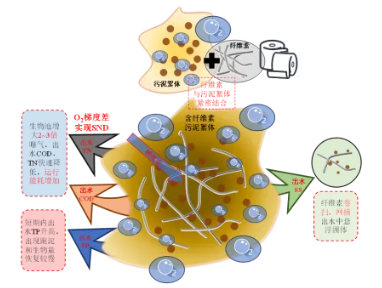 2.3 纖維素對運(yùn)行的影響纖維素對反應(yīng)器運(yùn)行影響是兩方面的,似乎均與其對污泥絮體致密程度有關(guān)。圖6總結(jié)了纖維素對反應(yīng)器運(yùn)行、能耗等方面的影響及其機(jī)理。纖維素通過自身線狀形態(tài)和官能團(tuán)可靠網(wǎng)捕卷掃作用將污泥絮體密實(shí)包裹,相當(dāng)于促進(jìn)絮凝,可降低出水ss以及其中所含n、p。