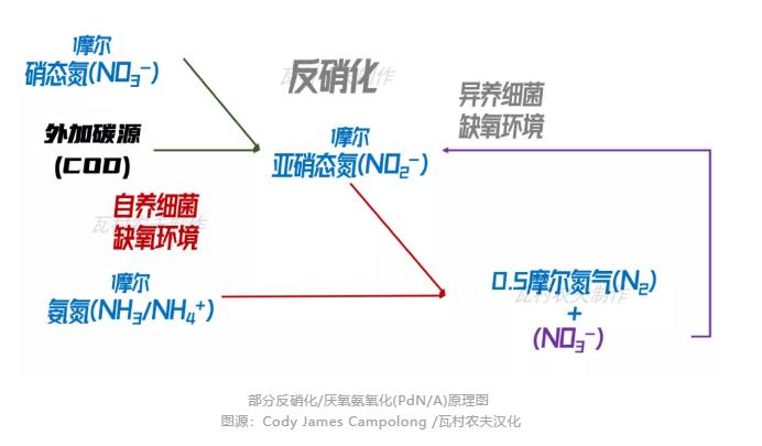 為什么要選擇進(jìn)行部分反硝化的反應(yīng)呢?請(qǐng)大家先再看一眼上邊的圖片:部分亞硝化/厭氧氨氧化(partial nitritation-anammox)除了能將亞硝酸鹽和氨氮轉(zhuǎn)化成氮?dú)庵?,還不可避免地生成硝酸鹽。